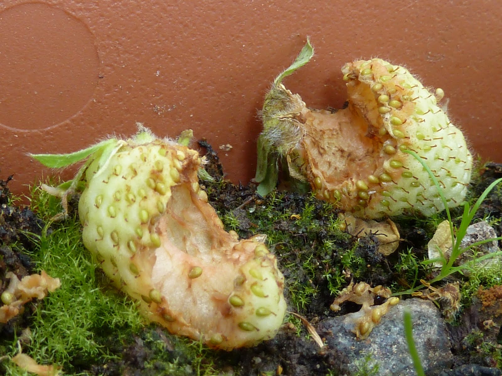 Att odla jordgubbar i växthuset har tidigare varit en stor hit eftersom fåglarna inte äter upp dem. Men i år har vi väntat och väntat på mogna jordgubbar och sen visade det sig att det verkar som att några hungriga möss äter upp skörden för oss. Nästan mogna bär är gnagda på och under krukorna ligger musspillning. Attans!